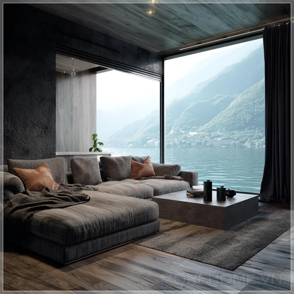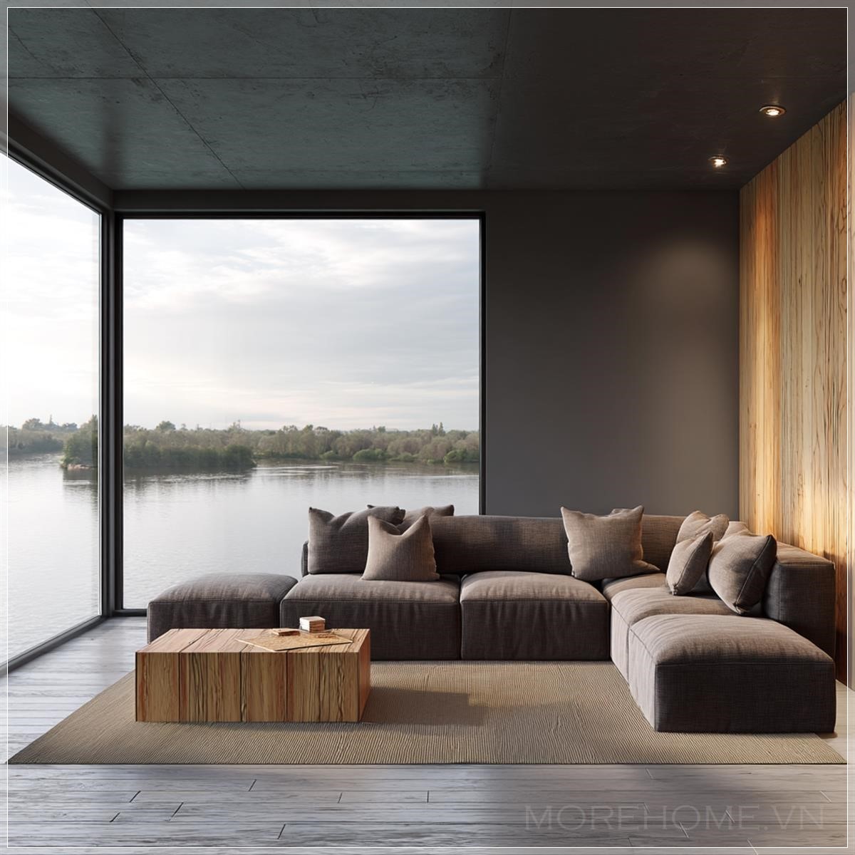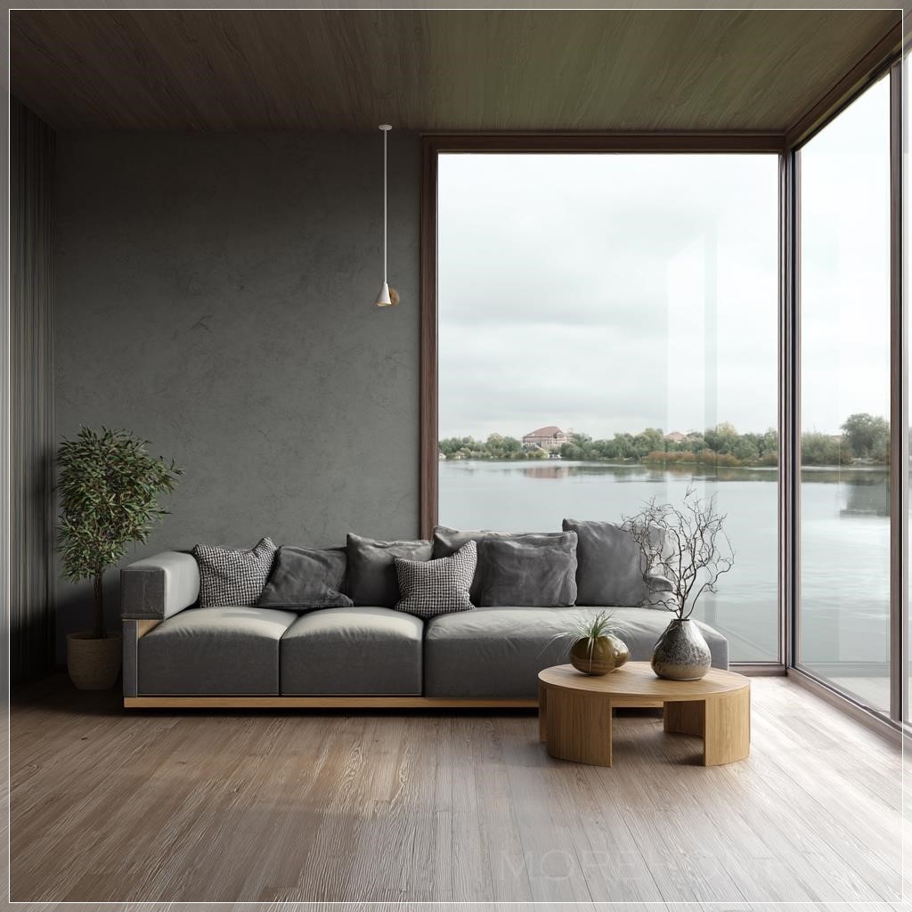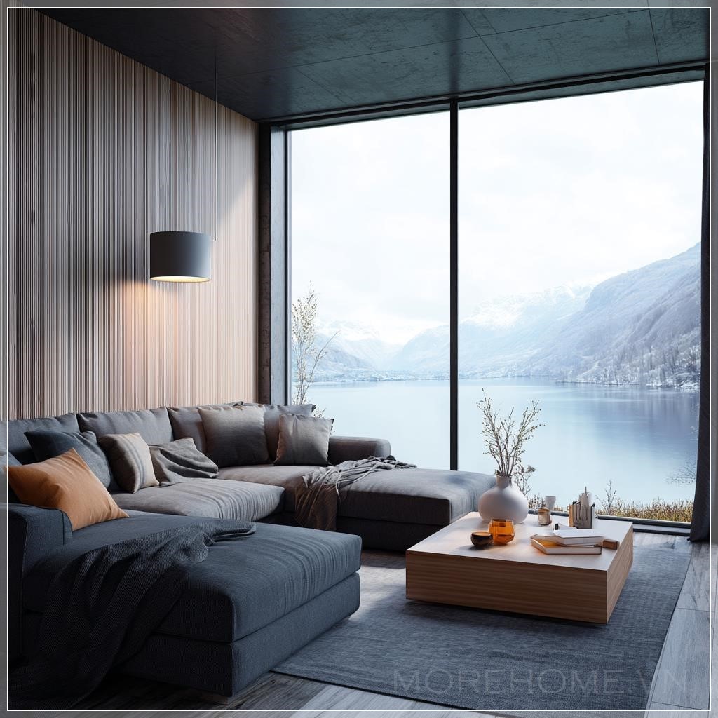 Phòng khách hiện đại với ánh sáng tự nhiên êm dịu, kết hợp giữa các chi tiết màu xám và gỗ. Chiếc sofa ấm cúng nằm cạnh cửa sổ kính lớn, nhìn ra hồ, tạo ra không gian thoải mái và thư giãn. Cảm giác tối giản và yên bình, nơi ánh sáng nhẹ nhàng chiếu qua cửa sổ, làm tôn lên vẻ đẹp của không gian.