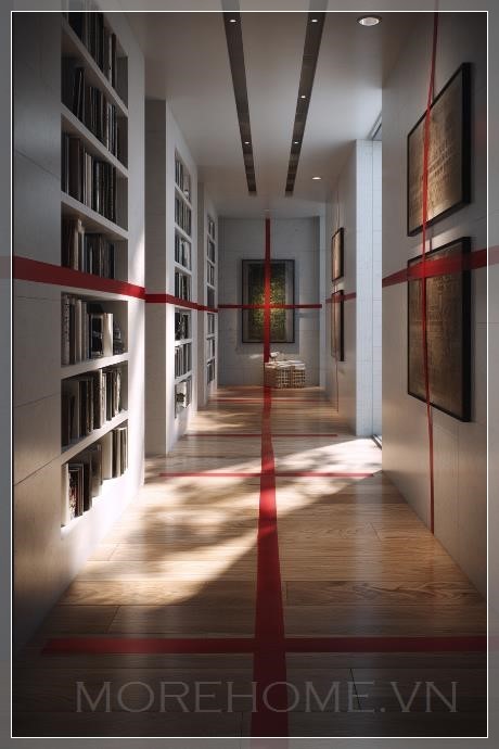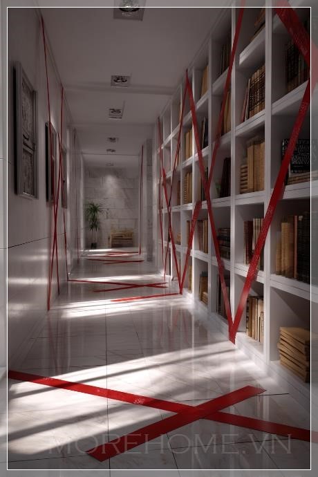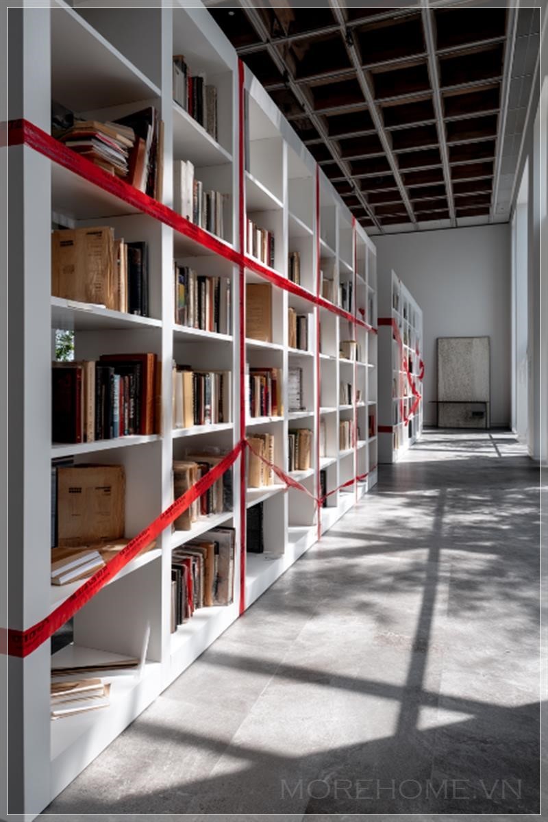 Trong không gian trắng tinh khôi của một phòng triển lãm, những cuốn sách đứng im lặng trên kệ như những nhân chứng câm lặng cho một cuộc đấu tranh không tiếng nói. Băng keo đỏ quấn quanh từng cuốn sách như những dây xích vô hình, biến những kho tàng tri thức thành những tù nhân của sự kiểm duyệt.