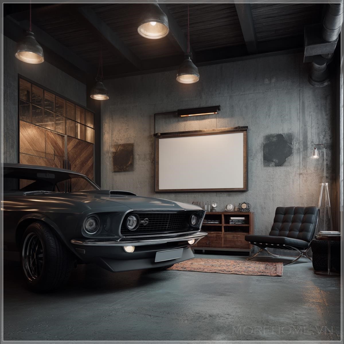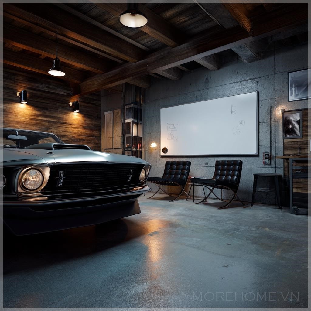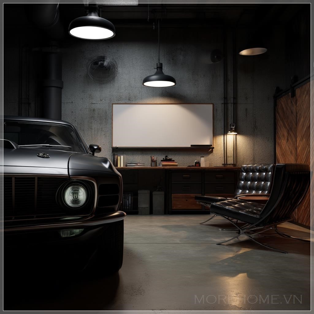 Ở góc phải của khung hình, silhouette của một chiếc muscle car cổ điển - có thể là Mustang hoặc Camaro - với cản trước và đèn pha đặc trưng chỉ lộ ra một phần nhỏ, tạo nên một chi tiết bí ẩn và thú vị. Sự xuất hiện tinh tế này không chỉ gợi lên niềm đam mê tốc độ và sức mạnh mà còn thể hiện gu thẩm mỹ tinh tế của chủ nhân - biết cách cân bằng giữa việc khoe đam mê và giữ gìn sự tinh tế. Chrome sáng bóng của cản xe phản chiếu ánh sáng amber, tạo ra những điểm sáng lung linh như những viên kim cương nhỏ trong không gian.