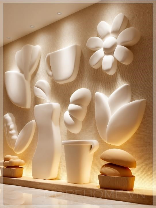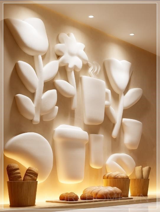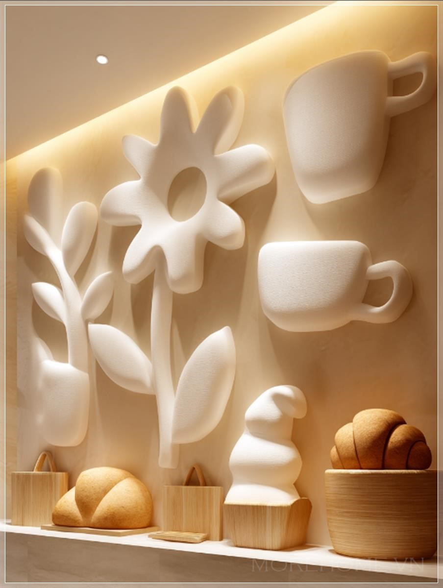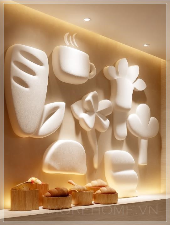 Bước chân vào không gian ấm áp của tiệm bánh, ánh mắt bạn sẽ ngay lập tức bị thu hút bởi bức tường nghệ thuật độc đáo phía trước. Đây không chỉ là một bức tường trang trí thông thường, mà là một tác phẩm điêu khắc relief 3D tinh xảo, nơi những hình ảnh quen thuộc của bánh mì và cà phê được tái hiện một cách sống động và đầy nghệ thuật.