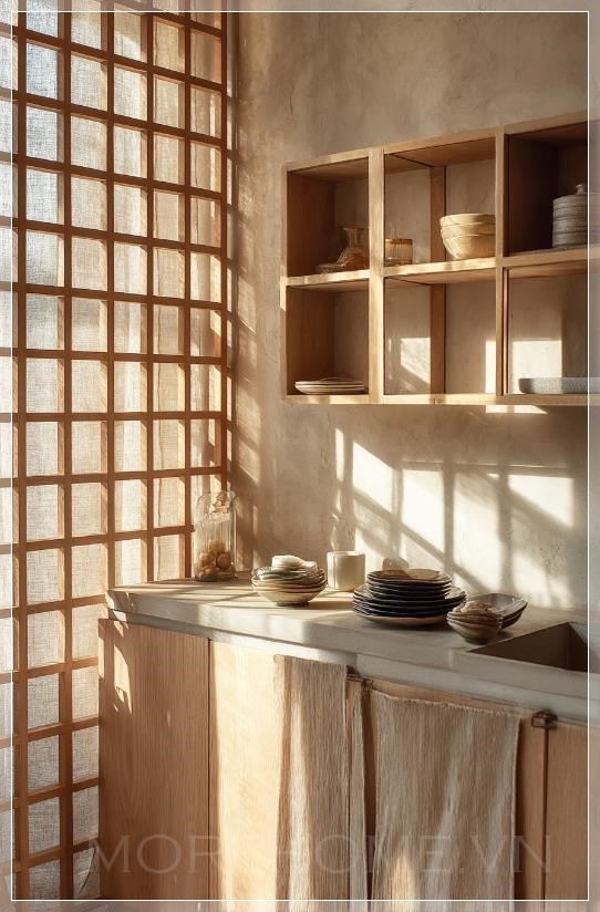 Ánh sáng tự nhiên đóng vai trò quan trọng trong việc tạo nên linh hồn cho không gian này. Những tia nắng mềm mại len lỏi qua cửa sổ, tạo ra những khoảng sáng tối đầy chất thơ. Bóng râm nhẹ nhàng được tạo ra bởi ánh nắng mặt trời không chỉ làm phong phú thêm tầng nghĩa thị giác mà còn mang đến cảm giác ấm cúng, gần gũi. Chính những chi tiết nhỏ này đã biến một không gian bếp thông thường thành một tác phẩm nghệ thuật sống động.