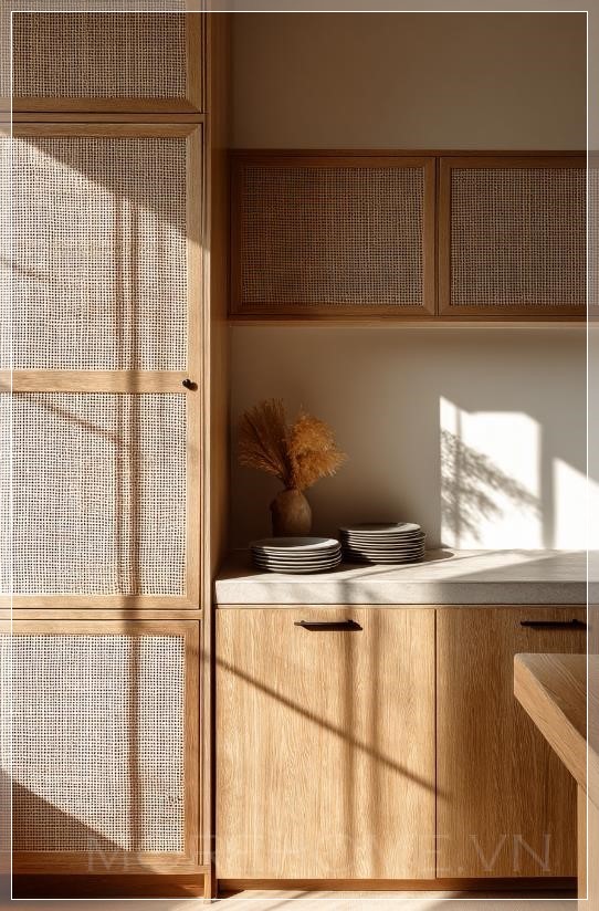 Có những khoảnh khắc trong ngày mà ánh sáng mặt trời len lỏi qua khung cửa sổ, nhẹ nhàng vuốt ve những đường nét gỗ tự nhiên, tạo nên một bức tranh sống động về sự thanh tịnh và ấm áp. Đó chính là cảm xúc đầu tiên khi bước vào không gian bếp này - nơi mà triết lý tối giản Zen được thể hiện một cách tinh tế nhất.