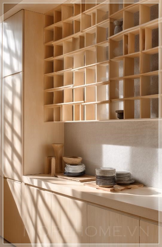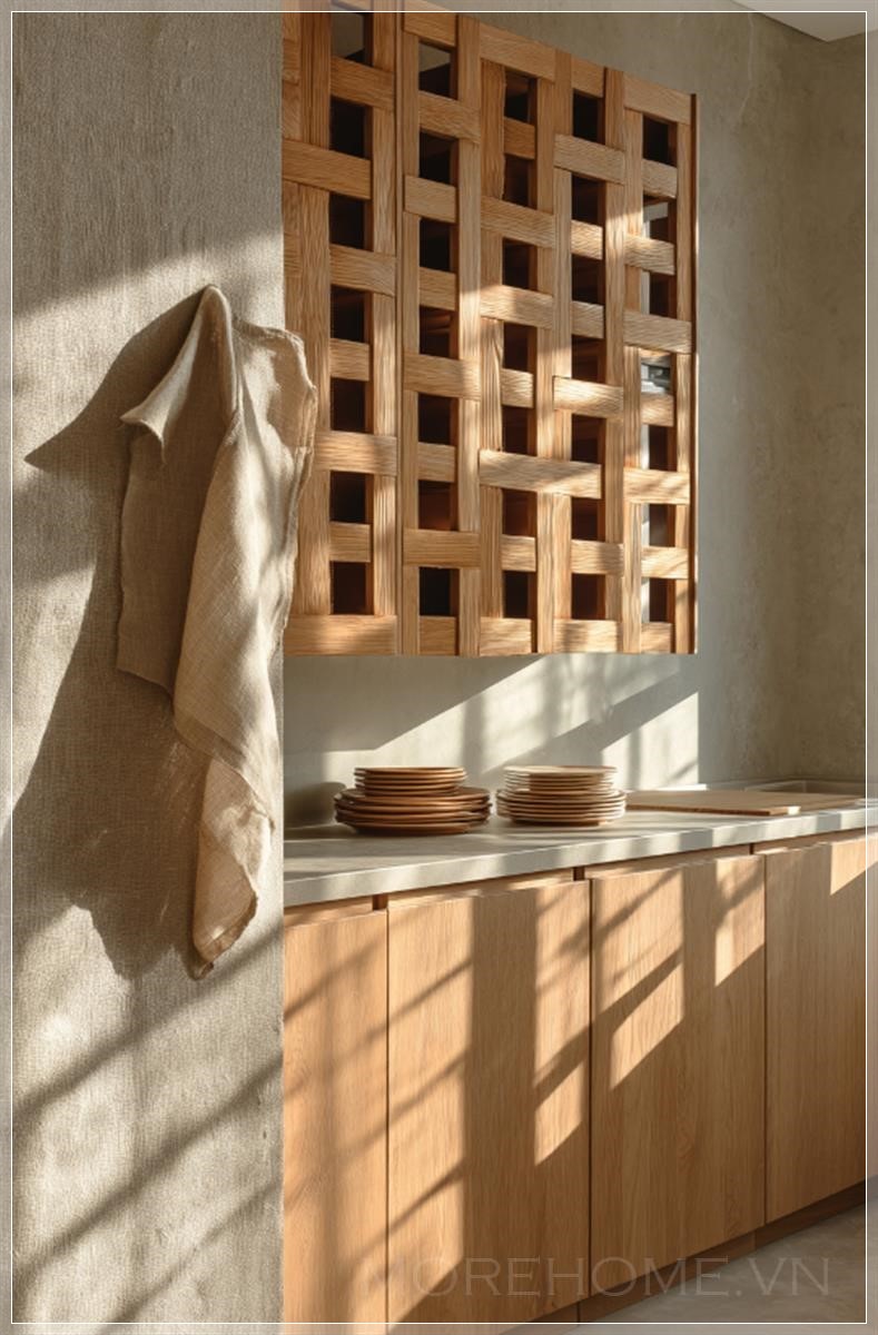 Những tủ bếp làm từ gỗ sáng màu không chỉ đơn thuần là nội thất, mà còn là tác phẩm nghệ thuật được chạm khắc tỉ mỉ. Họa tiết lưới gỗ phức tạp trên bề mặt tủ tạo ra những đường nét hình học độc đáo, vừa mang tính thẩm mỹ cao vừa thể hiện sự khéo léo trong từng chi tiết. Mỗi đường cắt, mỗi khớp nối đều được tính toán cẩn thận, tạo nên một tổng thể hài hòa và cân bằng.