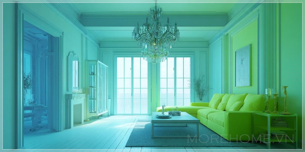 Ánh sáng tự nhiên chan hòa khắp không gian, tạo nên những dải màu chuyển động nhẹ nhàng từ xanh ngọc bích sâu thẳm đến xanh thiên thanh trong trẻo. Mỗi bức tường, mỗi món đồ nội thất đều được bao phủ trong lớp ánh sáng kỳ diệu này, khiến căn phòng trở thành một tác phẩm nghệ thuật ba chiều sống động. Không có bất kỳ sắc màu nào khác can thiệp vào sự hài hòa này - chỉ có hai tông màu xanh thuần khiết, tạo nên một thế giới riêng biệt và đầy cuốn hút.