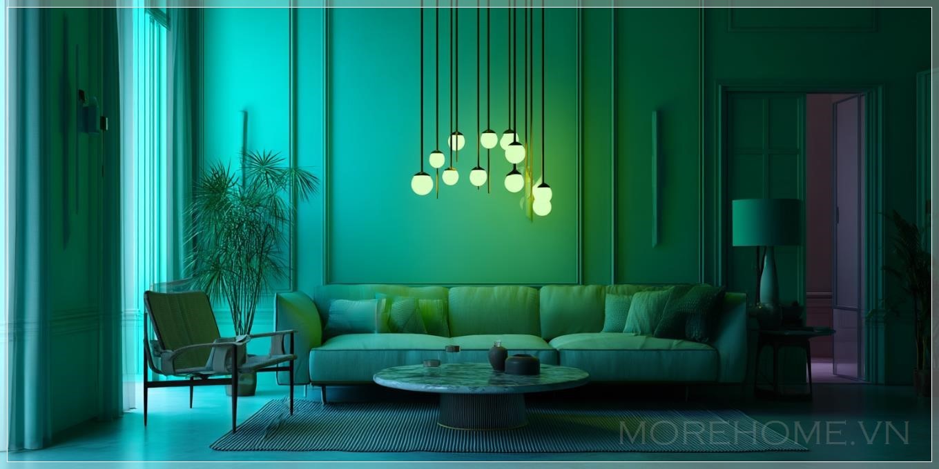 Điểm nhấn ấn tượng nhất của không gian chính là chiếc đèn chùm tuyệt đẹp treo giữa trần nhà. Với thiết kế hiện đại và tinh tế, chiếc đèn chùm này không chỉ đơn thuần là nguồn sáng mà còn là một tác phẩm điêu khắc ánh sáng. Những tia sáng phát ra từ đèn chùm tán xạ khắp không gian, tạo nên những hiệu ứng ánh sáng đầy ma thuật, khiến các sắc độ xanh trở nên sống động và cuốn hút hơn bao giờ hết.