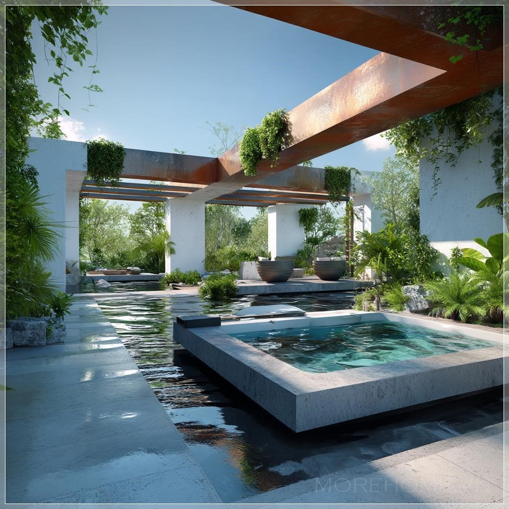 Ánh nắng mai dịu nhẹ xuyên qua những tán lá nhiệt đới, tạo nên những đốm sáng lung linh trên mặt đất. Không khí trong lành mang theo hương thơm ngọt ngào của những bông hoa kỳ lạ, hòa quyện cùng tiếng nước róc rách từ đài phun nước nhỏ ẩn mình sau khóm dương xỉ khổng lồ. Đây chính là khoảnh khắc hoàn hảo để thưởng thức một ly cà phê sáng trong khu vườn nhiệt đới hiện đại mà bạn đã ấp ủ bao lâu.