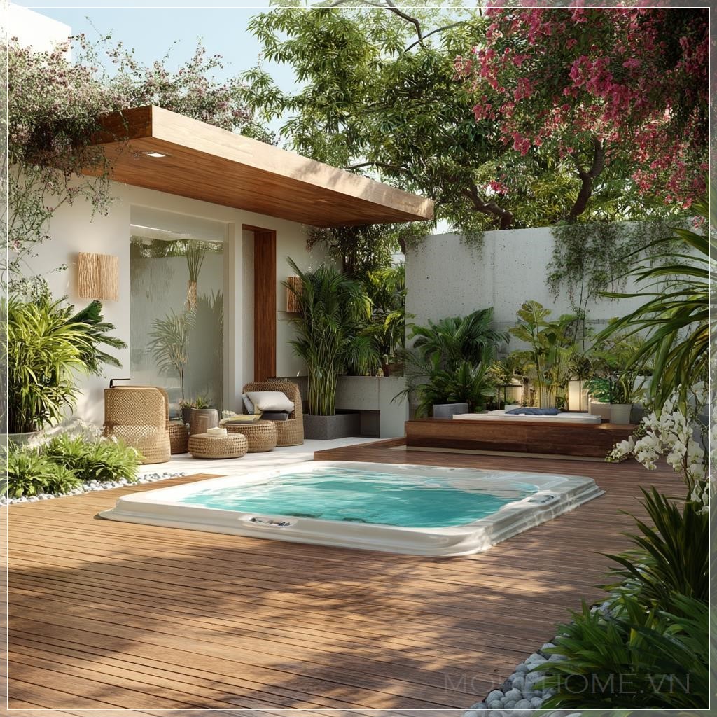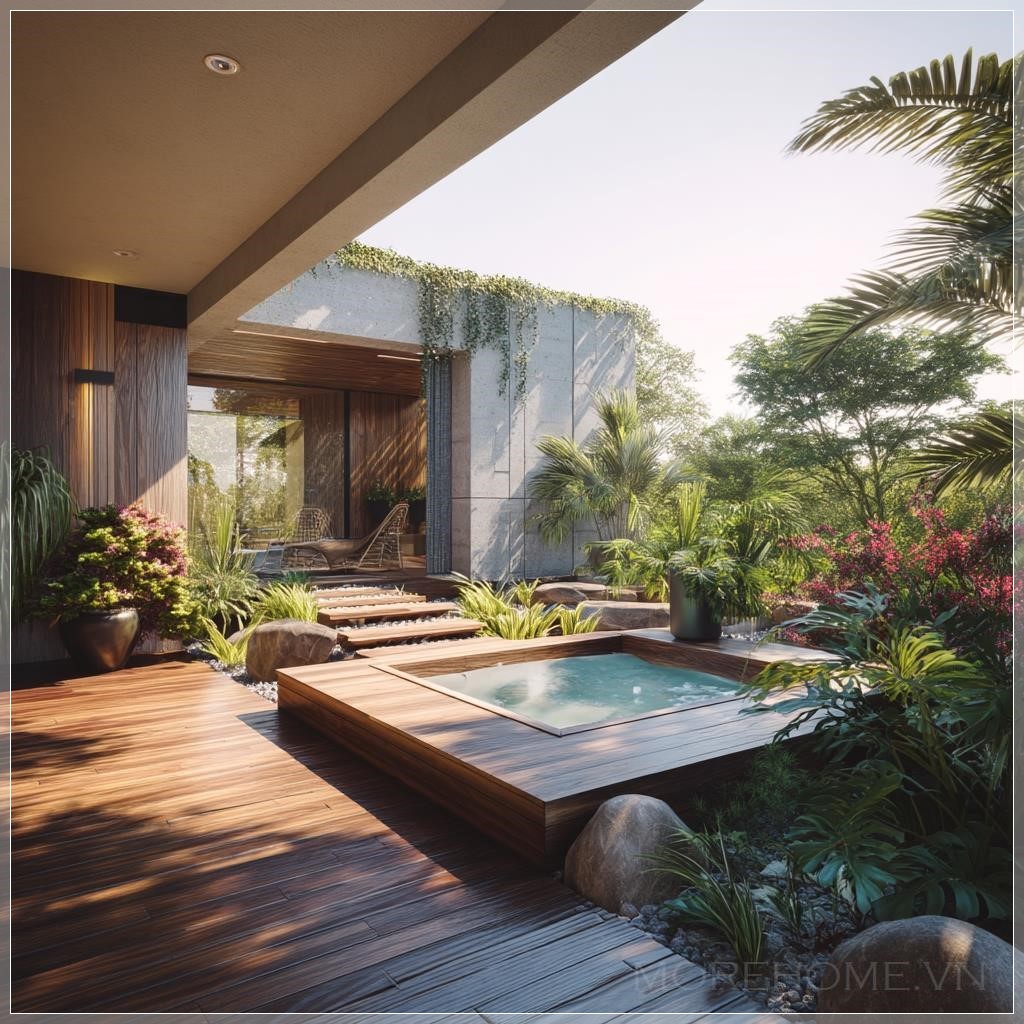 Ánh sáng chiều tà bắt đầu khiến cho không gian này trở nên kỳ diệu hơn bao giờ hết. Những chiếc lá to bản phản chiếu ánh sáng vàng ươm, tạo nên một màn hình tự nhiên đầy mê hoặc. Tiếng nước chảy nhẹ nhàng từ hệ thống tuần hoàn trong jacuzzi hòa quyện cùng tiếng chim hót xa xa, tạo nên bản nhạc thiên nhiên êm dịu nhất. Đây chính là lúc để thả mình vào làn nước ấm, để cảm nhận trọn vẹn sự kết nối giữa con người và thiên nhiên trong không gian sống hiện đại.