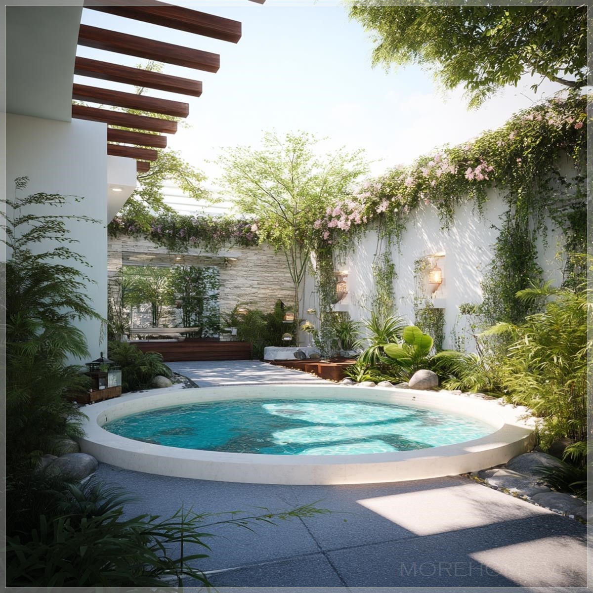 Trái tim của khu vườn là không gian trống ở chính giữa - một vùng đất thiêng liêng dành riêng cho bồn tắm jacuzzi tròn. Vị trí này được tính toán kỹ lưỡng để đảm bảo sự riêng tư tuyệt đối nhờ những bức màn xanh tự nhiên, đồng thời vẫn nhận được đủ ánh sáng mặt trời để tạo nên bầu không khí ấm áp, thư giãn. Hình dung việc ngâm mình trong làn nước ấm, được bao quanh bởi những âm thanh thiên nhiên và mùi hương thơm mát của các loài thực vật kỳ lạ từ khắp nơi trên thế giới.