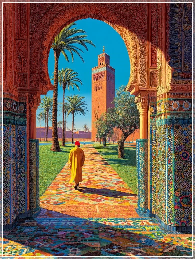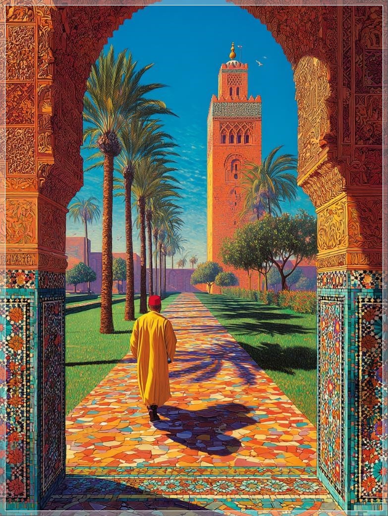 Một người đàn ông Morocco mặc chiếc djellaba vàng truyền thống đang bước chậm rãi về phía thánh đường. Trên đầu ông là chiếc fez đỏ đặc trưng, tạo nên điểm nhấn màu sắc nổi bật giữa khung cảnh. Bóng của ông in trên mặt đường như một nét vẽ mềm mại, kể lên câu chuyện về hành trình tâm linh mà mỗi tín đồ đều phải trải qua. Đây không chỉ là một chuyến đi vật lý, mà còn là cuộc hành hương của tâm hồn, nơi con người tìm về với chính mình trong sự yên bình thiêng liêng.