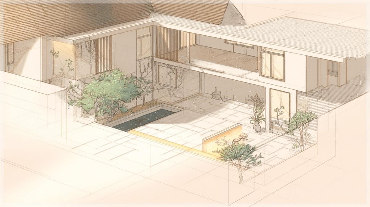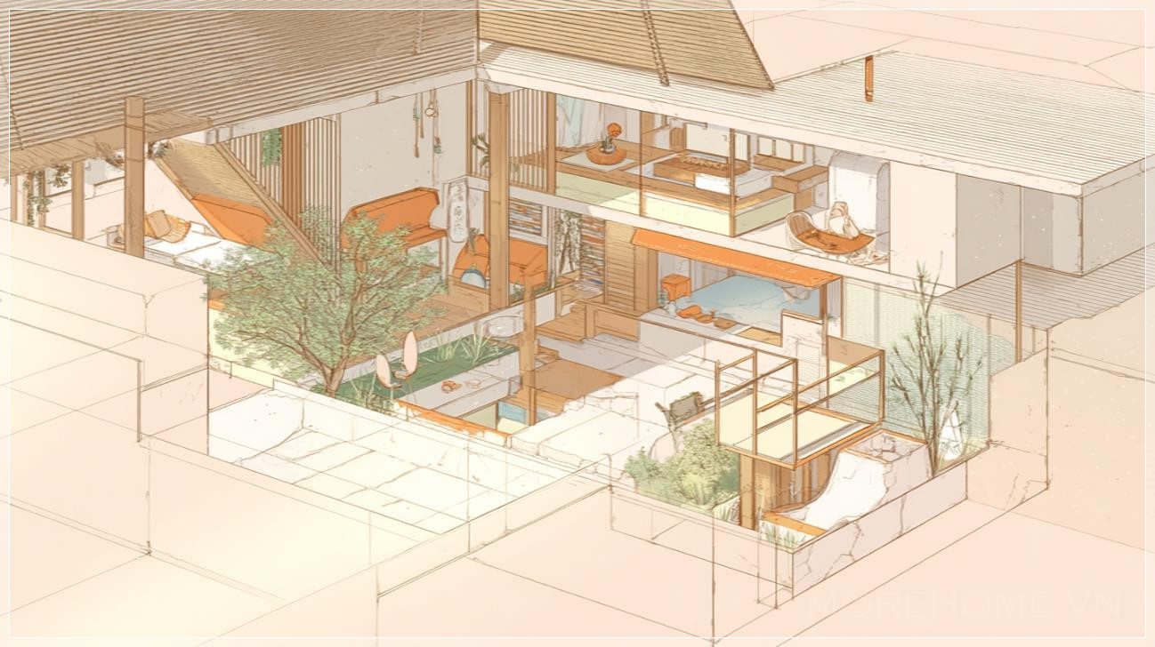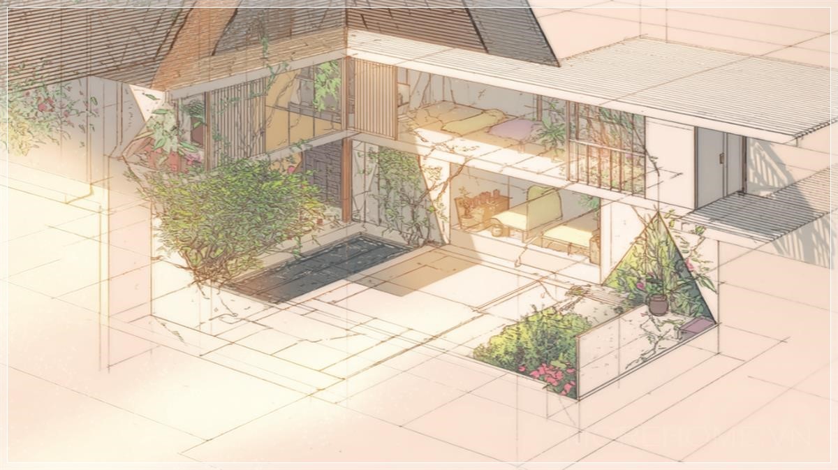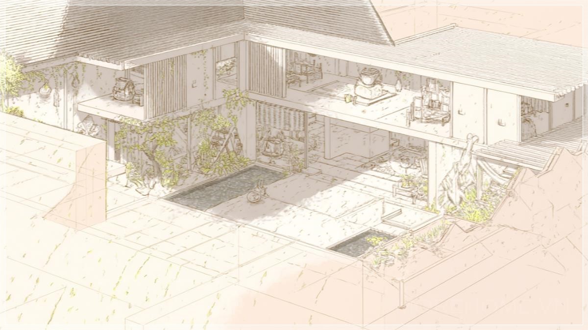 Trong thế giới thiết kế nghệ thuật hiện đại, các hình ảnh minh họa thể hiện không gian sân trong của những ngôi nhà siêu hiện đại luôn gây ấn tượng mạnh mẽ với người yêu nghệ thuật. Một trong những ví dụ tiêu biểu là tác phẩm minh họa dưới dạng axonometric với phong cách anime nhẹ nhàng, mang đến cái nhìn mới mẻ về một không gian sống tinh tế và độc đáo. Bằng cách kết hợp các đường nét thanh mảnh, ánh sáng nhẹ nhàng và màu sắc trung tính, tác phẩm này không chỉ là một bức tranh, mà còn là một trải nghiệm thẩm mỹ đầy cảm hứng.