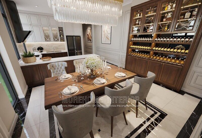 Tủ rượu của biệt thự, nhà phố được sắp xếp ngay trong không gian phòng ăn rộng thêm phần đẳng cấp, sang trọng.