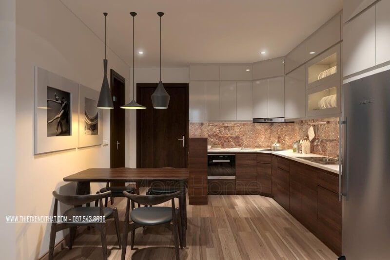 Thiết kế nội thất bếp chung cư và khu vực ăn uống liền kề, không tạo vách ngăn như các thiết kế truyền thống vì vậy mang đến cho không gian sống một sự liền mạch, thống nhất