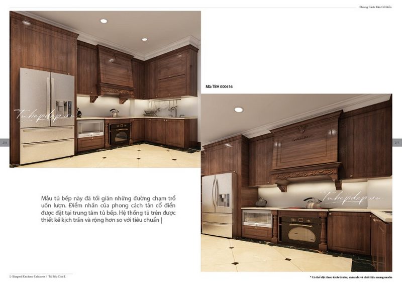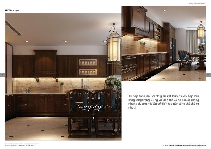 Cả tủ bếp trên và tủ bếp dưới đều được thiết kế theo hình chữ L từ chất liệu gỗ óc chó nâu đẳng cấp phong cách tân cổ điển mang đến cảm giác gần gũi nhưng không kém phần sang trọng.