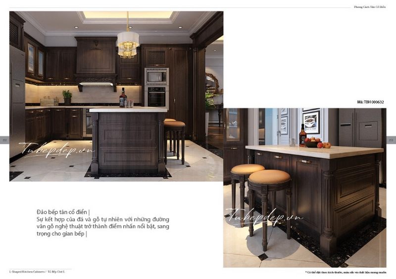 Kết hợp giữa những đường nét cổ điển pha với một chút hiện đại, tủ bếp óc chó tân cổ điển đã tạo nên một không gian nhà bếp biệt thự đầy sang trọng và mê hoặc