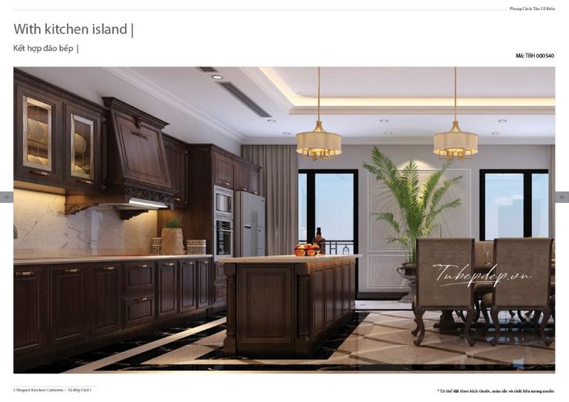 Tủ bếp tân cổ điển với gam màu nâu chủ đạo là điểm nhấn hoàn hảo cuốn hút mọi ánh nhìn của bất kỳ một vị khách nào tới chơi nhà
