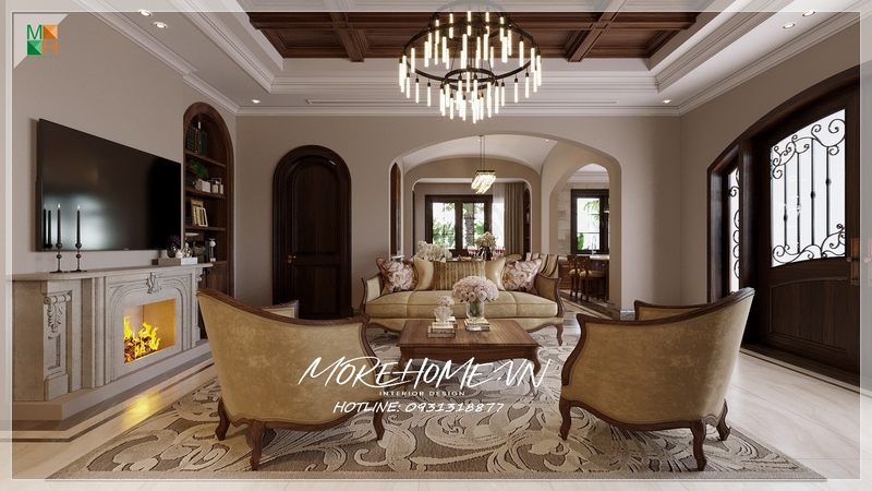 Morehome đã hoàn thiện việc thi công nội thất sofa phòng khách gỗ tự nhiên bọc vải sang trọng tại biệt thự FLC Thanh Hóa.