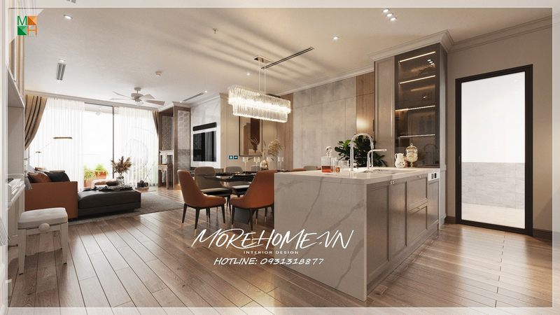 Tạo ra một không gian phòng ăn chung cư hiện đại liên kết với phòng khách để tạo ra cảm giác thoải mái và tiện nghi.