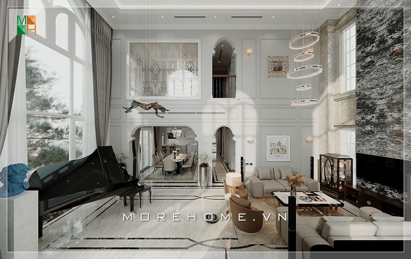 Nội thất phòng khách rộng được thiết kế với gam màu trung tính sẽ làm nổi bật nét đẳng cấp và sự sang trọng của ngôi nhà.