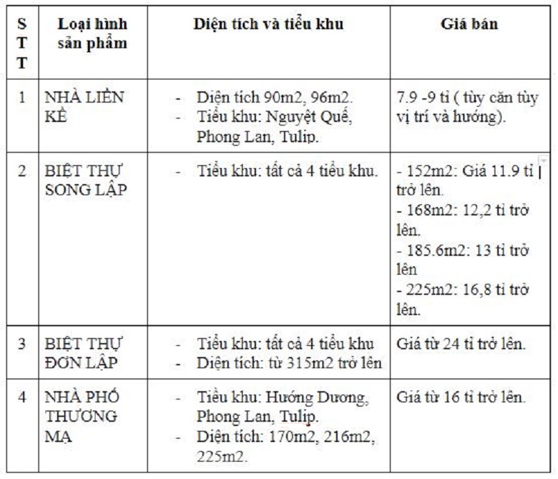 Biệt thự VIP 2: Diện tích từ 200 - 250 m2, biệt thự song lập, giá từ 12 - 15 tỷ, gồm 221 căn.